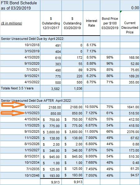 1. Notice that in the 03/20/2019 column amounts are much lower than they were just 15 months ago. The total due prior to 2022 is down $2.5 billion from $3,582 to $1,036 billion. Most of the decrease was a rollover of debt to later years but FTR has also paid off two bond issues worth about $800 million in the last 5 months. The numbers are from the 2017 and 2018 10-Ks. That is excellent debt management in my opinion.